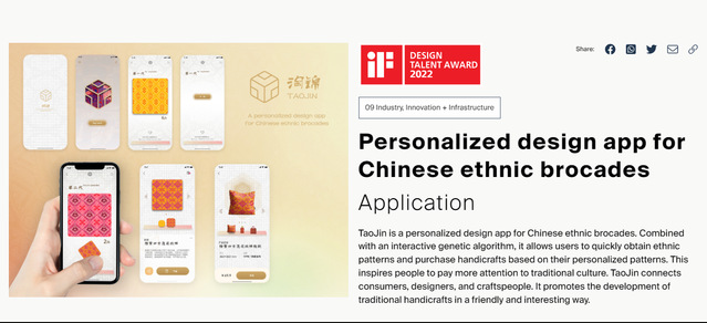 国际著名设计奖项2022年度德国IF Design Talent Award(IF设计新秀奖)获奖作品名单于近日揭晓,由吉祥坊 工业设计系曾栋副教授指导,工业设计硕士研究生关明、贺茂恩、鲍光毅、田梓瑜团队设计的作品“Personalized design app for Chinese ethnic brocades”在全球逾万件参赛作品中脱颖而出,斩获2022年IF设计新秀奖。