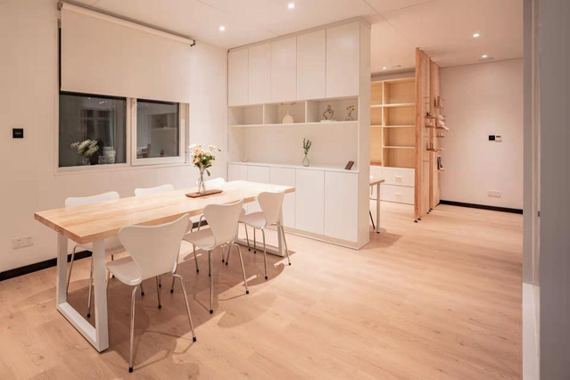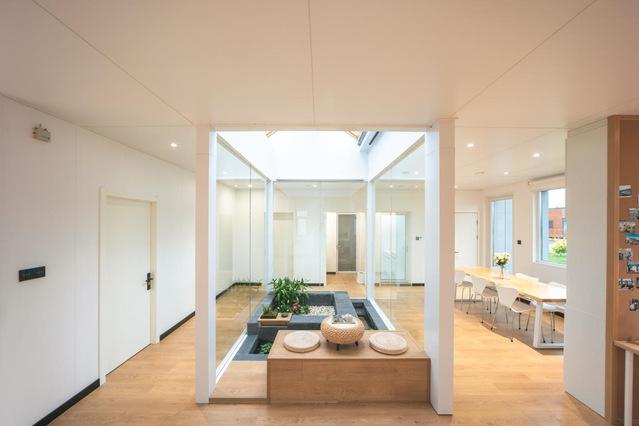 建筑布局充分考虑张北的气候特征,设备间位于西北角,用于缓冲隔绝冷空气;东南角设置阳光房,兼顾蓄热保温;北面的水池景观也同时是跨季节储能水池,北侧屋面抬升,便于夏季热压通风,避免冬季屋面积雪。功能布局方面,T&A HOUSE设计借鉴九宫格的空间布局,以中庭为中心进行功能布局,使建筑有“内外及中间,了然无一碍”的通畅感。建筑内部空间,通过隔板的推拉与家具的可变,完成不同的空间转换,满足居家生活、访客社交等多种场景,在有限的使用空间内实现最大的使用功能。所有空间的布局都与中庭呼应,营造“所以日阳中,向君言自在”的居住感受。另外,建筑还通过多专业系统功能耦合,将太阳能光热、光电、地热多能归一,实现跨季节储能、跨昼夜储冷。T&A House通过被动式设计和主动优化以及太阳能的使用,实现了能源的自给自足,据实测,我校SDC参赛建筑全年发电量约为14000度,而建筑全年耗电量约为6000度,产能远大于耗能,有效实现了建筑全年零能耗运行。