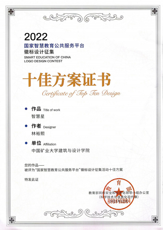 2022年12月30日,教育部网络安全和信息化领导小组办公室公布了“国家智慧教育公共服务平台”徽标征集活动获奖方案名单,吉祥坊 林裕熙老师的作品“智慧星”获评为十佳方案。