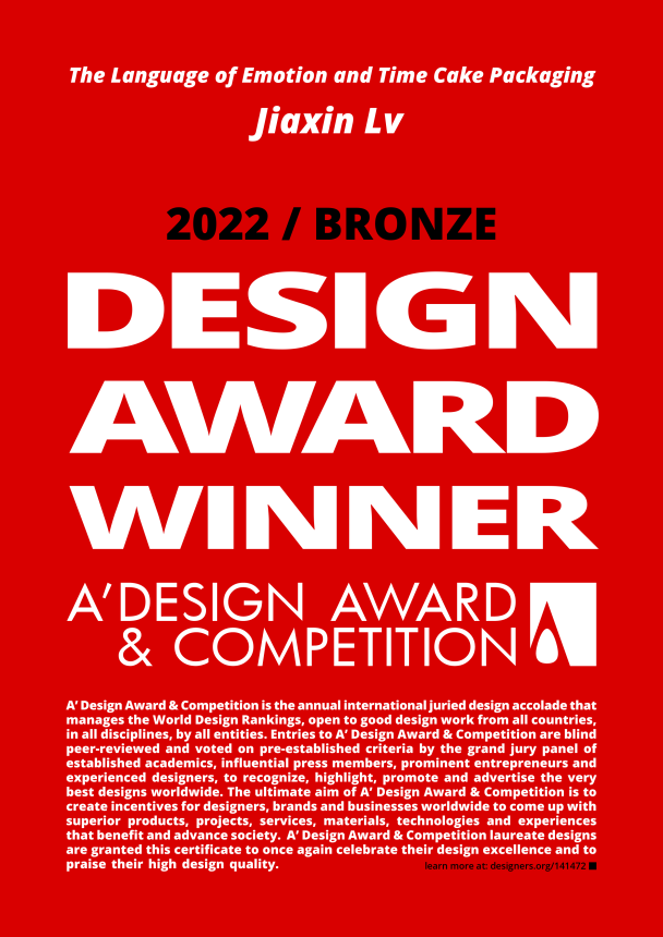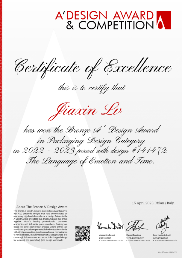 2022-2023年度意大利A’ Design Award设计大赛评选结果于近期公布,吉祥坊 2021级工业设计工程专业硕士研究生吕嘉鑫等同学的设计作品“The Language of Emotion and Time”荣获产品包装类铜奖,该作品由工业设计系教师朱兆华博士指导完成。设计作品强调从用户角度出发,进行创新创意,追求卓越的设计品质。
