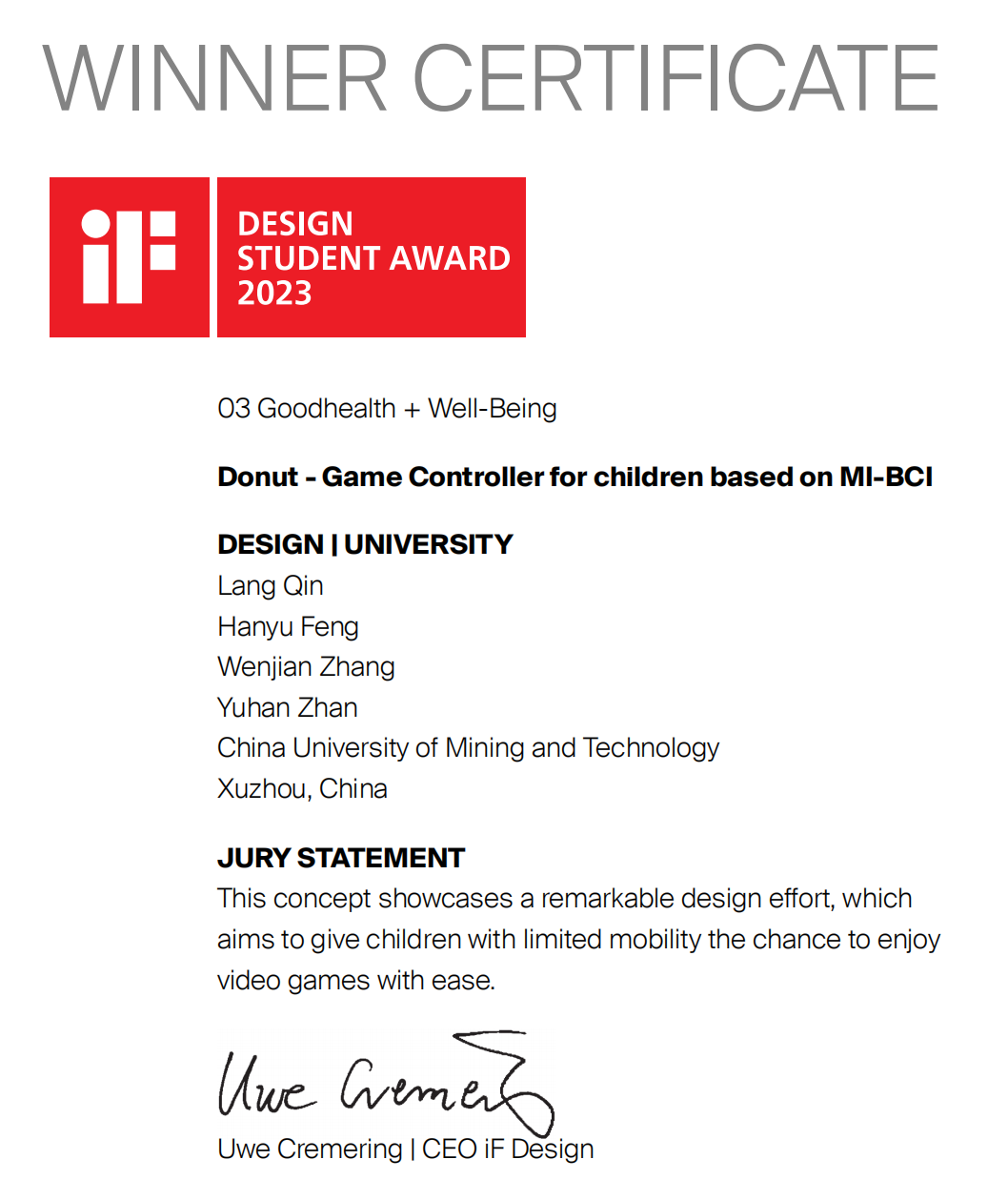 国际著名设计奖项2023年度德国iF Design Student Award(iF设计新秀奖)获奖作品名单于近日揭晓。由中国矿业大学吉祥坊 工业设计系邵将副教授指导,工业设计工程硕士研究生秦烺、冯汉禹、张文剑、詹雨涵团队设计的作品“Donut - Game Controller for children based on MI-BCI”在全球逾六千件参赛作品中脱颖而出,斩获2023年iF设计新秀奖。