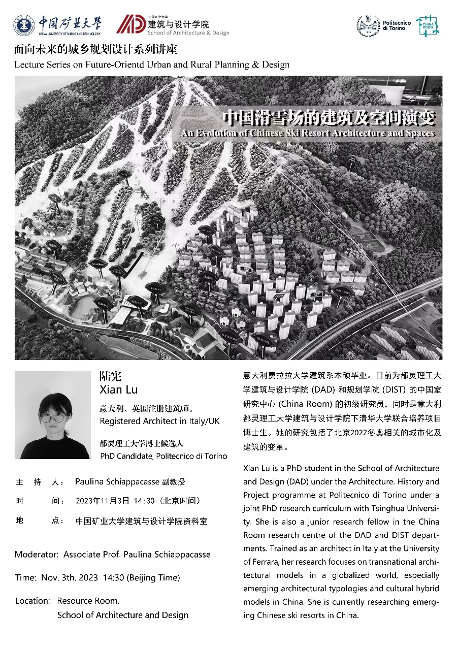 2023年11月3日下午,应Bernhard Müller院士邀请,意大利、英国注册建筑师,意大利都灵理工大学博士候选人陆宪,在一楼资料室为设计学院师生做“中国滑雪场的建筑及空间演变”学术讲座。Bernhard Müller院士、城乡规划系主任常江教授、城乡规划系Paulina Schiappacasse副教授、建筑系林岩副教授、环境设计系教师赵潇及相关专业学生代表在现场聆听讲座。讲座由Paulina Schiappacasse副教授主持。