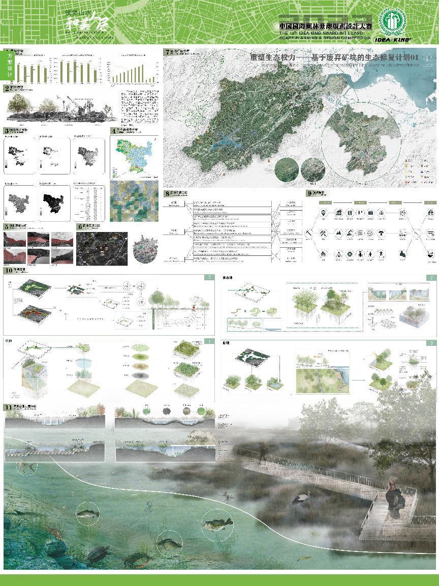 《重塑生态权力——基于废弃矿坑的生态修复计划》以杭州市老虎山矿坑为设计研究场地,运用景观设计学理框架,对工业废弃地矿坑进行景观再生设计思考。该方案采用遥感技术对场地进行生态敏感性分析,进而将矿坑分为重点生态保护区域、次级生态保护区域、轻度开发区域、重点开发区域四个部分,注重矿坑内“土壤-水体-空气”生态修复的系统再生过程。在分析生态恢复周期后,对矿坑内部进行适宜性建设,设置植物园、民宿、泵道等活动场所,整体串联四个矿坑区域,以生态恢复为核心带动该片区的经济发展活力。该作品充分考虑矿坑现存的问题、地形、材质、空间特点,重整矿坑绿色景观点、绿色景观线、绿色景观面,以经济节约的生态可持续设计方法再塑矿坑有机景观体系。