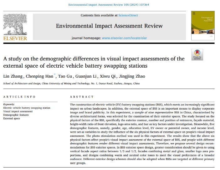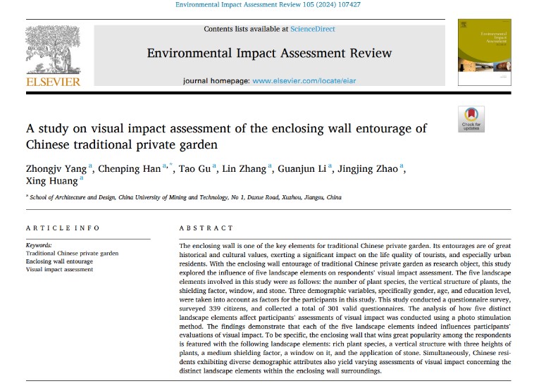 2024年3月,吉祥坊 韩晨平教授团队在社会学研究领域国际权威期刊《Environmental Impact Assessment Review》同期发表两篇高水平论文,该期刊为SSCI一区TOP期刊,所获发表的论文题目分别为《A study on visual impact assessment of the enclosing wall entourage of Chinese traditional private garden》和《A study on the demographic differences in visual impact assessments of the external space of electric vehicle battery swapping stations》。我校为论文唯一署名单位,韩晨平教授为两篇论文的通讯作者兼第二作者,吉祥坊 2021级硕士研究生杨中举、张琳分别为两篇论文的第一作者,2021级硕士研究生顾焘、2020级硕士研究生李冠君、2022级硕士研究生赵晶晶、黄兴、亓习武为共同作者。