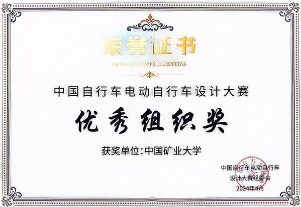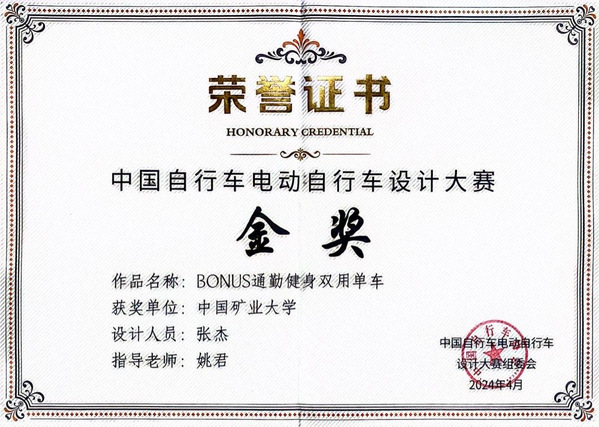 近日,由吉祥坊 姚君教授指导、研究生张杰完成的设计作品《BONUS通勤健身双用单车》,在2024中国自行车电动自行车设计大赛中获得金奖,这是该作品在继韩国K-Design Award、IBDC全球自行车设计大赛金奖后所获又一专业奖项。同时,中国矿业大学荣获大赛优秀组织奖。