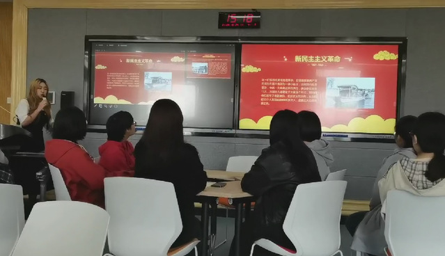 活动前期,团支书李紫薇阅读相关资料,查阅相关新闻报道,制作活动PPT并筛选百年党史相关视频。组织委员陈致远和宣传委员蔡文浩提前到场地进行准备工作。会上,团支书李紫薇为大家介绍本次团课开展的背景,主要包括习近平总书记的讲话和共青团中央讲话。随后她介绍百年党史,用鲜活的例子讲述党的历史上的重大事件,给大家播放了有关党史的影视作品。