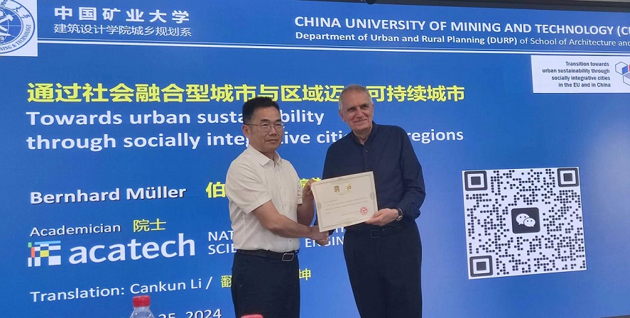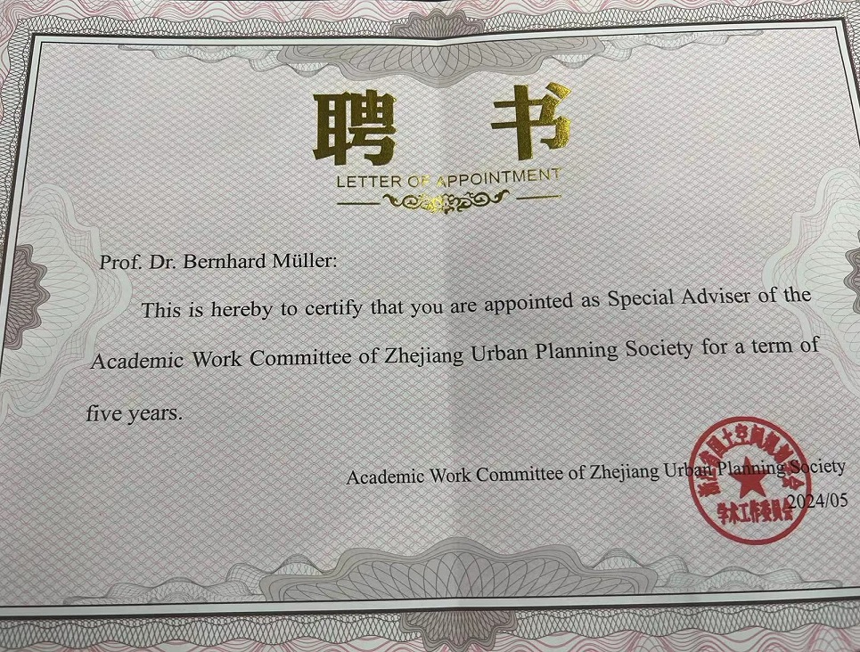 5月25日,应浙江省国土空间规划学会学术工作委员会的邀请,吉祥坊 Bernhard Müller院士参加了该委员会首届学术交流会,并做“通过城市和区域的社会融合实现城市的可持续性(Towards Urban Sustainability Through Socially Integrative Cities and Regions)”报告。同时,Bernhard Müller院士被浙江省国土空间规划学会学术工作委员会聘任为特别顾问。