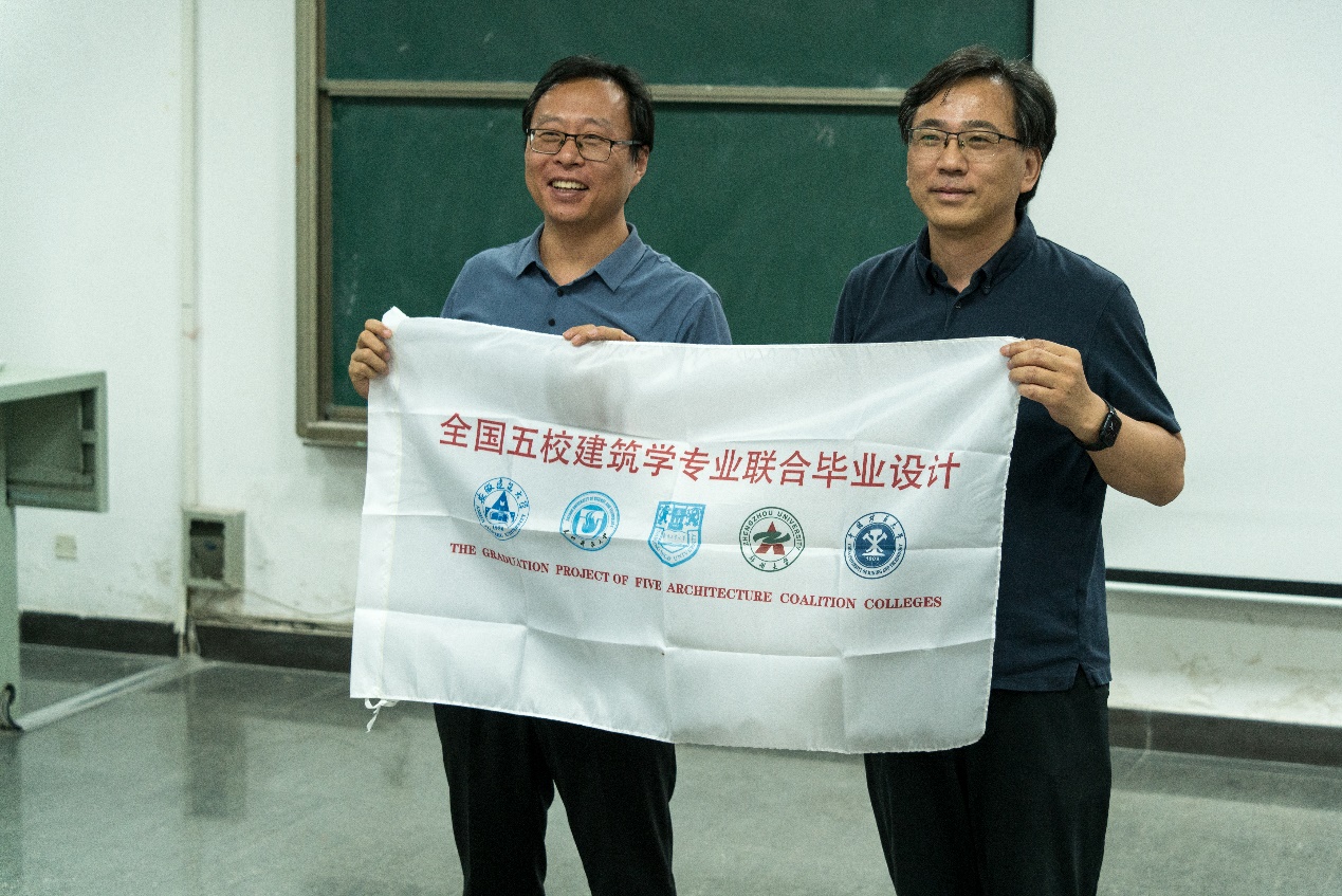 6月5日下午,答辩闭幕式在A310举行。林祖锐教授宣读了获得“优秀奖”的学生名单,组织了颁奖仪式。苏州科技大学建筑学院常务副院长邱德华进行总结,他对同学们勇于探索的精神和呈现的优秀成果给予了高度评价。最后,邱德华、孙良分别代表苏州科技大学和中国矿业大学进行了会旗交接,2025年第九届全国五校建筑学专业联合毕业设计将由我校承办。