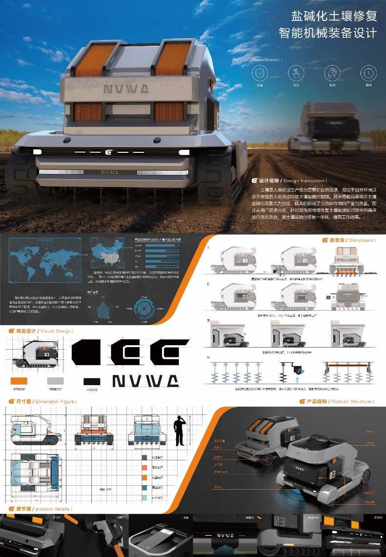 在本次大赛中,吉祥坊 2023级工业设计工程专业硕士研究生黄璐的设计作品《盐碱化土壤修复智能机械装备设计》荣获“紫金奖∙工业设计大赛”作品组唯一金奖。该作品为高寒地区土壤盐碱化修复装备的优化提供了解决方案,设计从用户需求及工作流程、人因工程等角度出发,使修复装备实现一体化,以提高工作效率与用户体验,同时,方案还结合绿色发展理念,装备了太阳能充电系统。