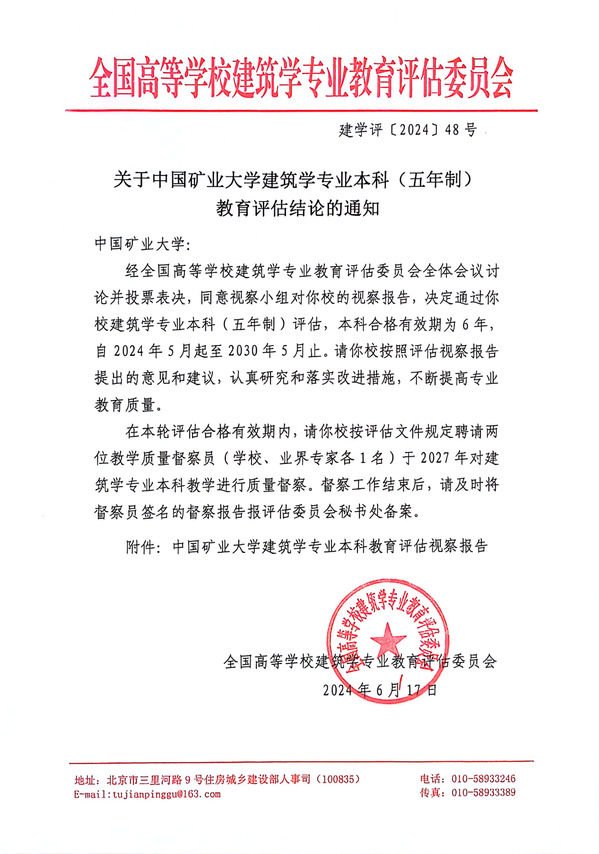 近日,全国高等学校建筑学专业教育评估委员会下发《关于中国矿业大学建筑学专业本科(五年制)教育评估结论的通知》,我校建筑学专业以最高等次通过评估,本科合格有效期为六年,自2024年5月起至2030年5月止。