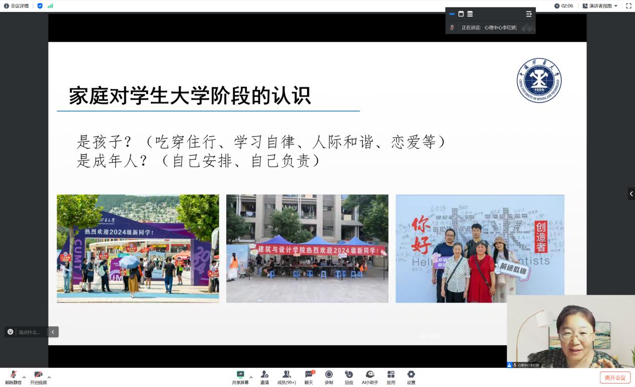 李红娇老师首先做报告,她的报告内容涵盖家庭对大学阶段认知、学生身心发展特征、新生面临挑战、大学生心理健康主要特点及常见现实问题与心理影响。她强调家长需持续关注孩子,全面了解以实现有效支持,共同营造良好成长氛围。