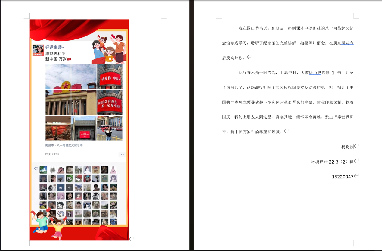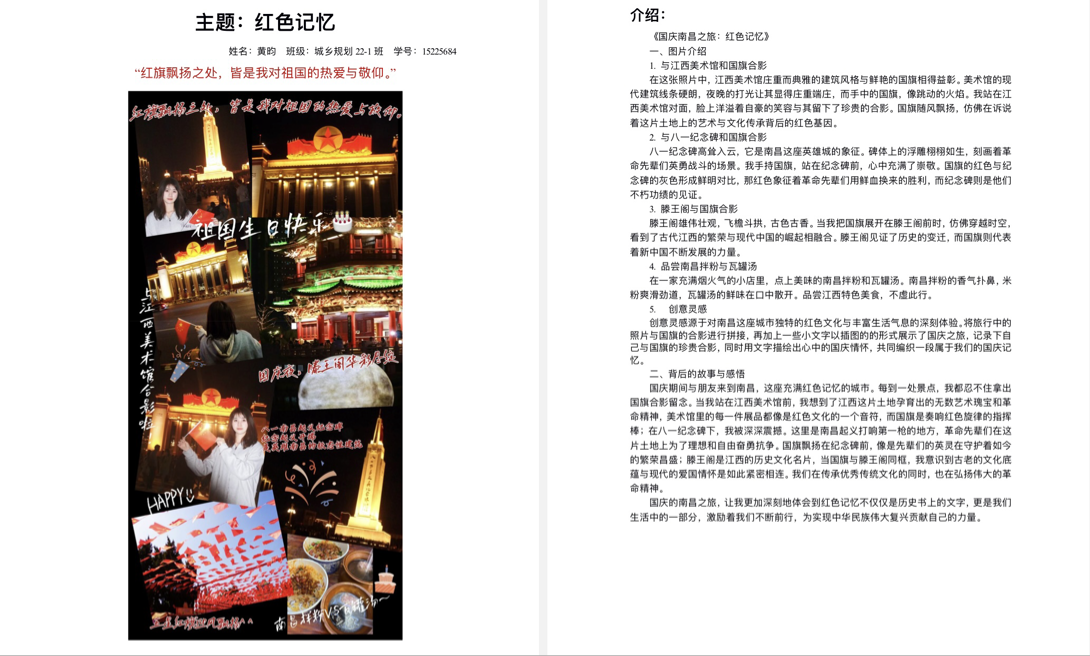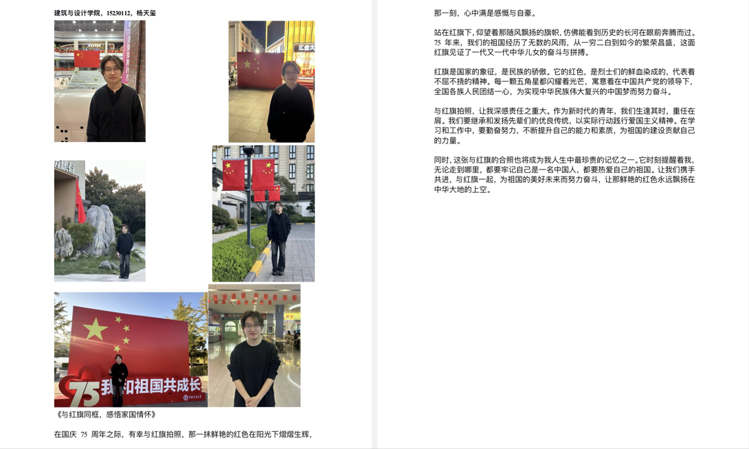 活动期间,同学们积极打卡上传作品。参赛同学前往纪念馆、纪念碑等承载记忆之所,与国旗庄重合影;或者用镜头记录家乡国庆期间的风土人情并将国旗融入其中;还有的捕捉国旗下的青春瞬间,展现青春风采。同学们围绕三个主题,呈现照片背后的故事与自己的爱国情怀。
