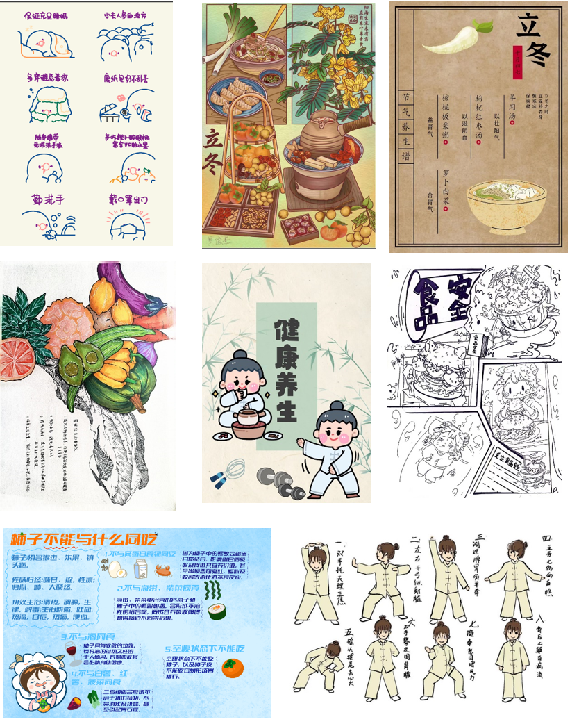 参赛者们巧妙运用绘画与拼贴的艺术手法,创作出一系列既生动又富有创意的作品,展现了他们对健康生活方式的理解。参赛作品内容包括“健康生活习惯”、“传统养生食物”以及“食物相克的知识”等多个方面,不仅锻炼了学生的绘画技能,也具有宝贵的教育意义。