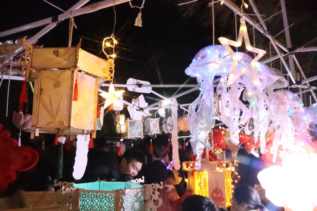 “灯展”活动由团委承办,歌声朗朗,灯光熠熠。在本次灯展活动中,吉祥坊 展出各式花灯,有激光切割、手工拼装的木质、布质花灯,有结合专业设计模型作品制作的花灯,也有手工捏塑的陶瓷花灯。除了成品花灯的展览外,同学们还在现场裁纸、拼贴、装饰,设计制作出一盏盏靓丽的花灯。灯展现场还设置了猜谜语活动,吸引了师生积极参与。