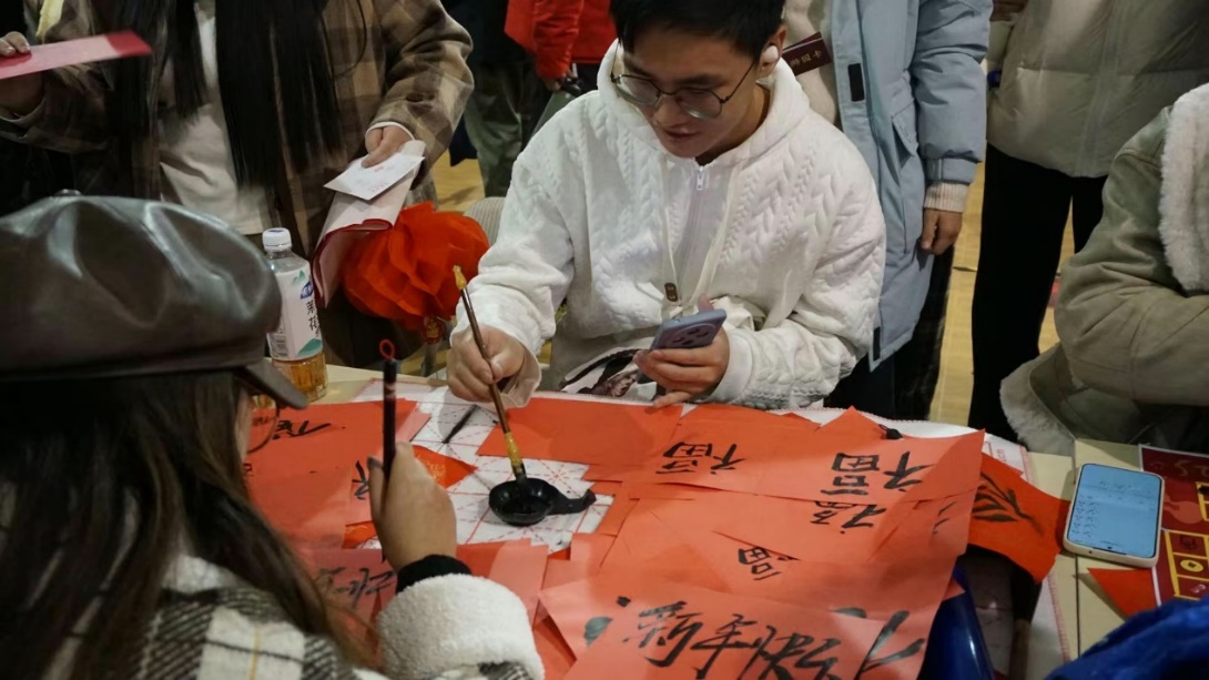 “游艺宫”活动由学生会承办,设置了手写祝福、福卡拓印、新年福气棋、乒乓球祈福大挑战等八项游艺项目。活动现场,同学们用纸笔写下新年的祝福,拓印出多彩的新年福卡,同学们感受着元旦佳节喜气洋洋的氛围,体验着新年伊始的活力。