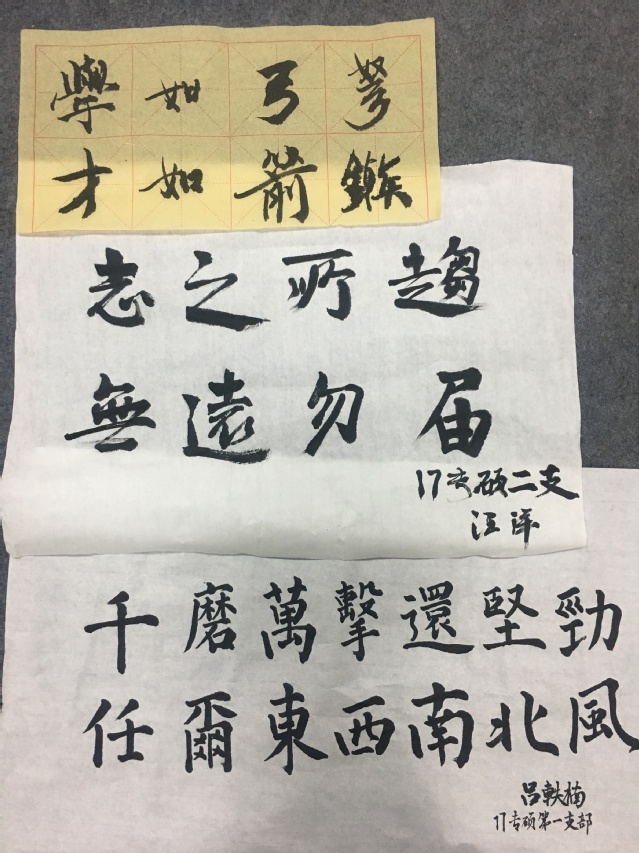 会议伊始,全体党员同志一同观看了《平“语”近人――习近平总书记用典》节目第十一集“咬定青山不放松”。通过观看视频,党员同志们对“文化自信”的内涵有了更深刻了解,主要学习了“为什么要有理想信念”、“应该树立什么样的理想信念”以及“怎样坚持理想信念”三方面的内容。视频观看结束后,党员工作站结合学院的专业特色,围绕“习近平总书记用典”展开了“习中华文字”书法交流,“千磨万击还坚劲,任尔东西南北风”、“学如弓弩,才如箭镞”、“志之所趋,无远勿届”,在场同志积极参与,用一幅幅文字作品来表达信仰和决心。