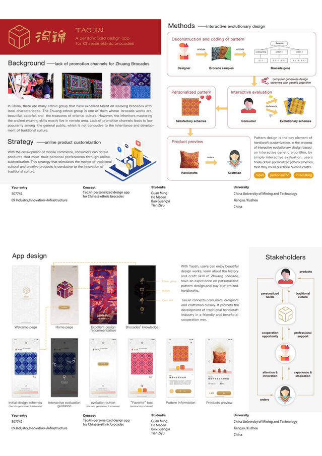 IF设计新秀奖竞赛主题是面向联合国可持续发展目标开展的创新、创意设计。设计团队结合自身研究方向,认真思考选题,不断对参赛作品进行改进与完善,实现了智能交互研究与文化创新创意设计应用的有机融合。该作品是一款针对壮锦图案个性化设计的手机应用程序“淘锦”;“淘锦”中不仅构建了传播壮锦图案文化意蕴的知识库,更是结合交互式遗传算法,使计算机能够自动生成壮锦图案设计方案,并让用户通过左右滑动表达他们的喜好;算法会在这种简单有趣的交互中获取用户偏好,并据此进行优化迭代,直到用户获得最满意的图案方案。在获得满意图案方案后,“淘锦”还提供完整的线上个性化定制服务,为锦缎工匠及其背后的民族手工艺产业探索了新的商业渠道。“淘锦”将消费者、设计师和工匠联系在一起,为传统手工艺在信息时代的发展赋予了设计内涵。
