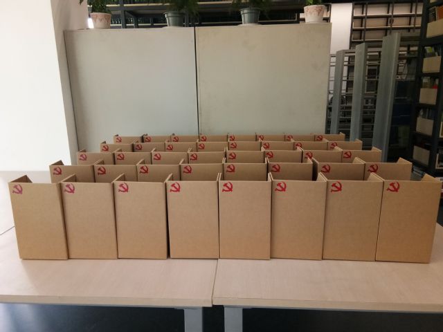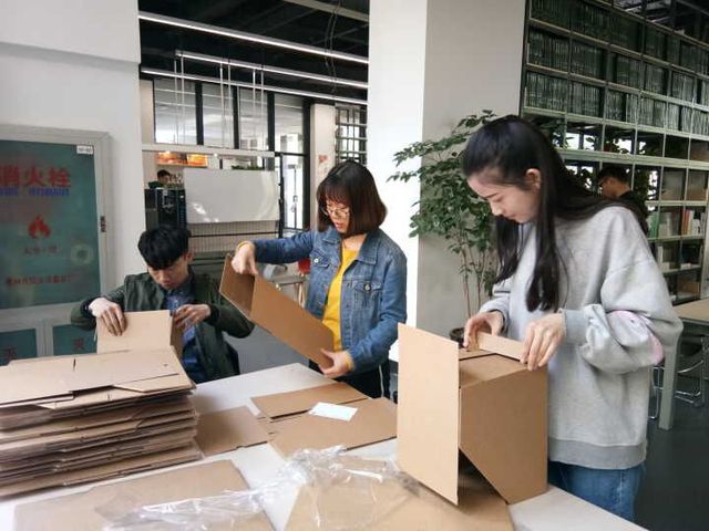 活动伊始,参与活动的同学们便紧锣密鼓地着手准备,将准备好的纸板整齐叠放拆封,大家工作热情高涨,协调一致,分工明确。通过精细地裁剪,巧妙地折叠,将纸板折叠成上方开口的盒状,通过三个小时的辛勤付出,大家制作出一个又一个精巧美观的书盒,并整齐排列在新开设的党员书柜上。书盒上贴有党徽,在一排排整齐的书盒上显得格外醒目,为书盒增添了一抹亮色,同时也突出了党员书柜的主题特色。