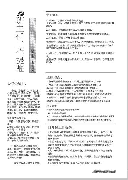 会议现场还发放了《班主任工作提醒》,《班主任工作提醒》从学工新闻、班级动态、四月工作提醒与心理小提示四个方面向班主任老师简要介绍了近期学生工作开展情况。春季是一年当中气温、气压、气流、湿度等最为变化无常的季节,也是各类心理问题的多发季节。会上,范韶维副书记特别强调要关注学生的心理动态,她希望班主任与辅导员老师多观察了解学生,给予学生更多的关爱。本次会议的召开是新形势下加强和改进学生工作的一次广泛动员,进一步明确了教师的职责及努力方向,增强了教书育人、立德树人的责任和意识。接下来,学院将坚持贯彻立德树人根本任务,遵循思想政治工作规律、遵循教书育人规律、遵循学生成长规律,再接再厉,推动学院教育管理工作再上新台阶。