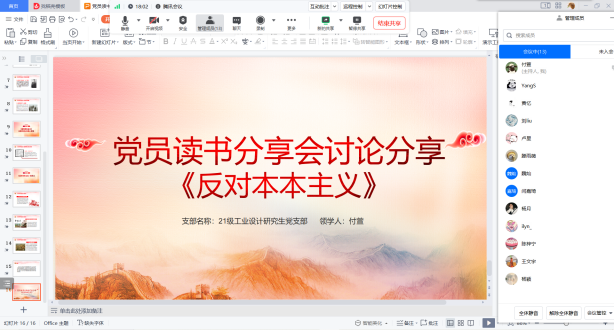 4月18日晚,吉祥坊 举行2023年第八期“读经典·明初心”研究生党员读书分享会,本次采取读书会以线上方式进行。21级工业设计研究生党支部全体党员参加活动,活动由党支部书记付萱主持。