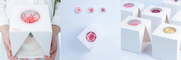 “The Language of Emotion and Time”作品旨在通过融入包装的鲜花元素,向用户传达不同的花语及蛋糕的新鲜程度。视觉语言上,每一款包装盒上印制不同色彩的波点图形,波点的排布方式以自然界花朵花蕊中出现的斐波那契数列为灵感。