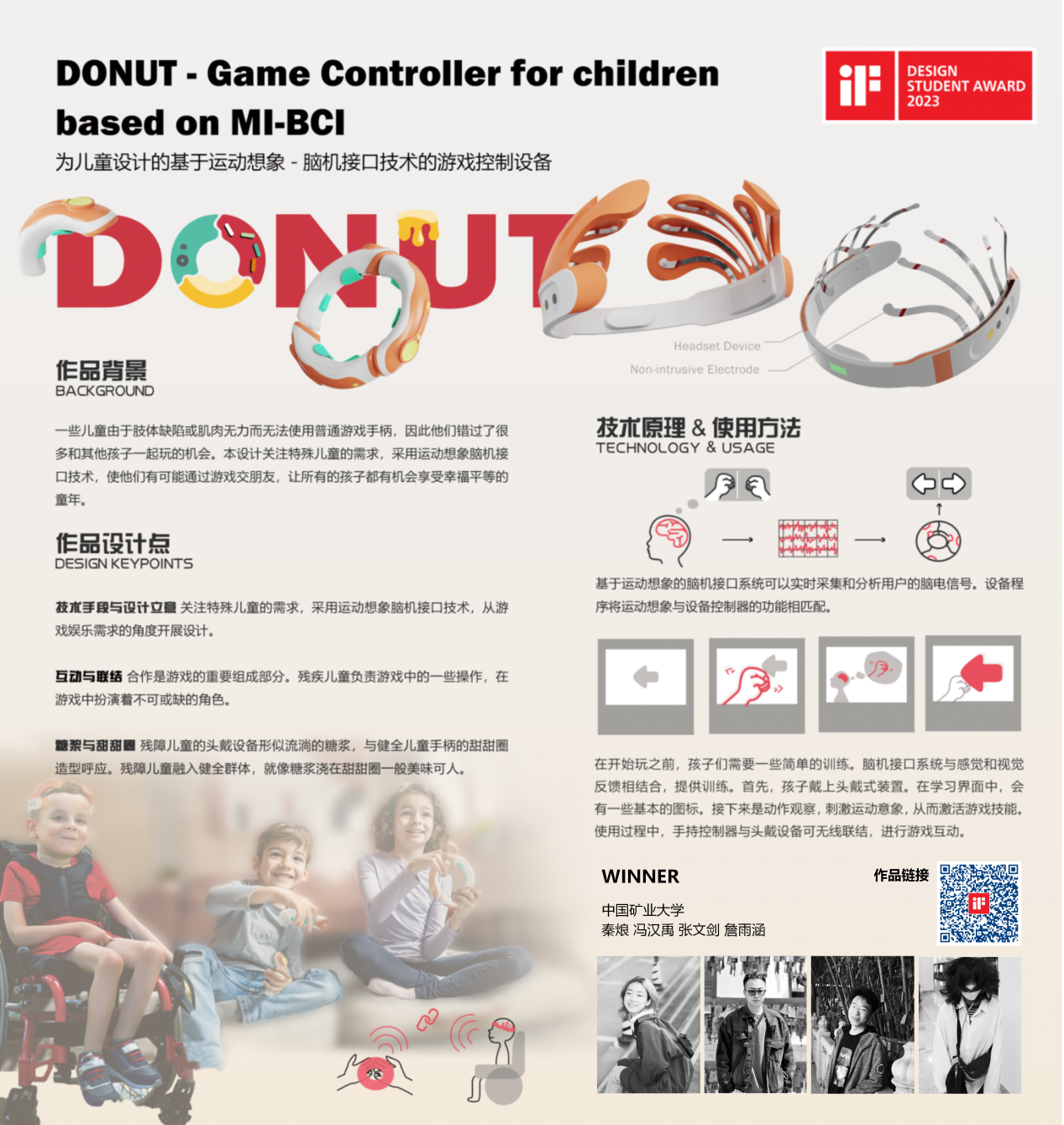 国际著名设计奖项2023年度德国iF Design Student Award(iF设计新秀奖)获奖作品名单于近日揭晓。由中国矿业大学吉祥坊 工业设计系邵将副教授指导,工业设计工程硕士研究生秦烺、冯汉禹、张文剑、詹雨涵团队设计的作品“Donut - Game Controller for children based on MI-BCI”在全球逾六千件参赛作品中脱颖而出,斩获2023年iF设计新秀奖。
