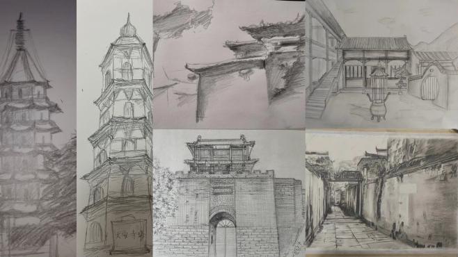 团队成员们首先对家乡古建筑进行了详细的调研,随后成员们通过绘画的方式展示了自己眼里的古建筑。其中包括河南省焦作市博爱县月山镇境内的月山寺;山东省淄博市沂源县普安禅寺;浙江省湖州市吴兴区的飞英塔;距丹东市城东十五公里的鸭绿江畔的虎山长城;湖北省大冶市金湖街道九古奇村上冯村;浙江省义乌市绣湖公园大安寺塔。调研过程中,成员们通过素描绘画感受古建筑的空间布局和建筑构成;亲手触摸体会古建筑的年代感,了解古建筑使用的材料;查阅资料、向管理人员询问等来了解古建筑的历史背景,翻新变化。古建筑是家乡的重要文化之一,它们不仅体现着当地的文化魅力,也诉说着当地的历史。此次实践活动能将古建筑和人文历史相结合,同时能展现古建筑的美与奇妙。希望通过此次活动能够更好地宣传古建筑,了解古建筑,保护古建筑。