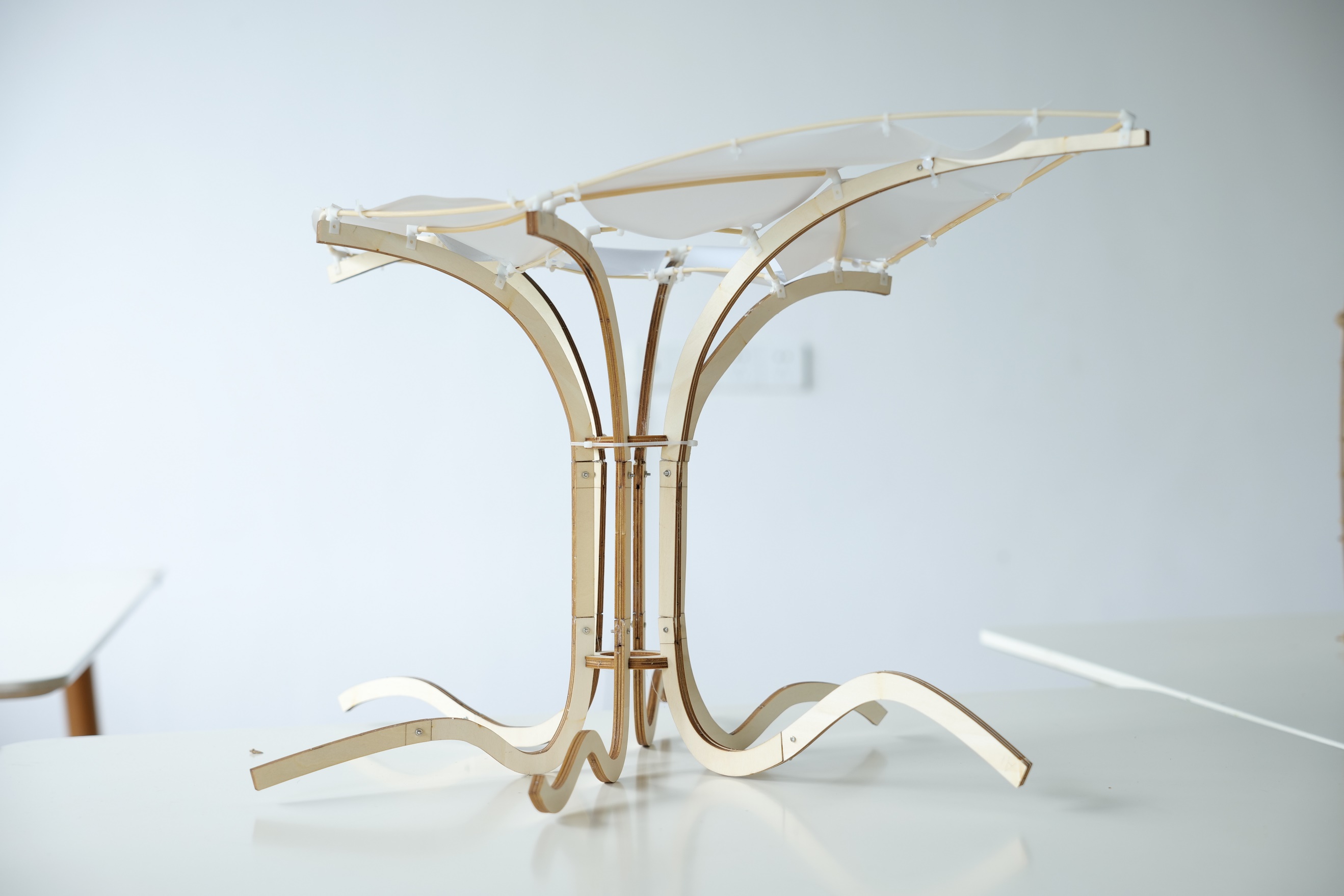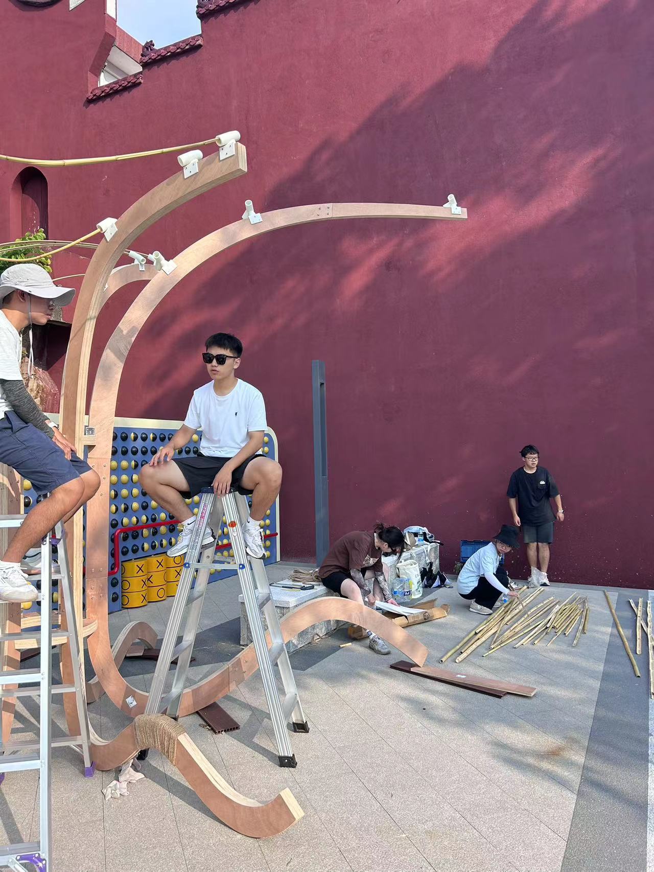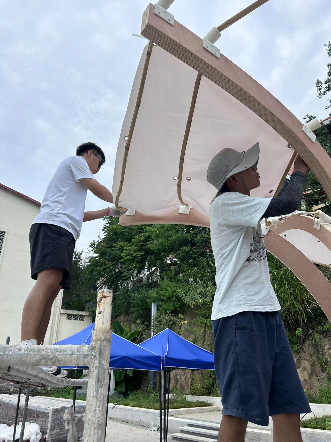 吉祥坊 参赛团队由朱文龙、邓元媛、林裕熙三位老师担任指导工作,建筑学21级徐境奕、谭昊蓝,张邵一、苏畅、李晗煜五位同学全程参加设计与搭建工作。参赛作品名称为“蔓·延”,灵感来源于福州市市树榕树,由树的生根、长骨、蔓延、开枝散叶的生长状态为形态设计依据。设计中通过弯曲的木质主龙骨、竹质次龙骨、定制3D打印节点以及pvc拉张膜等节点设计,解决了悬挑结构受力稳定、木构件在三维空间中弯曲、不同材料主次龙骨连接等问题。在现场搭建中对于材料加工不全、地坪不平整、雷电天气等问题也进行了灵活应对。参赛队员们在整个搭建过程齐心协力、争分夺秒、不惧困难,圆满完成任务。最终构筑物在日间呈现出迎风招展、飘逸潇洒的“蔓延”形态,夜间在投影的映射下呈现虚幻绚烂的光影,更加切合了本次建构大赛“元·构”的主题。搭建完成后,引来许多村民和游客驻足观看,得到了评审专家及当地群众的肯定。